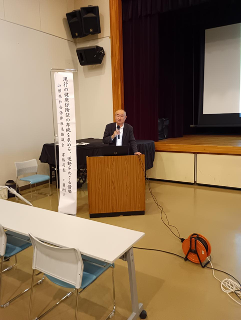 まず、山形県社会保障推進協議会の工藤剛さんを講師にお招きし、「現行の健康保険証の存続を求める運動をめぐる情勢」という学習会が開催されました。